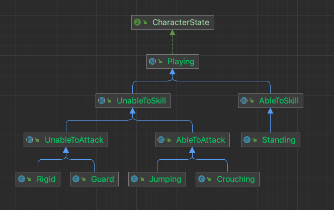 자 맨 꼭대기에 Playing이라는 메서드로 게임에 참여하는 캐릭터 상태를 추상화 했는데요, 여기서 요구사항에 가만히 서있는 상태에서만 스킬을 사용할 수 있다! 라는 요구사항이 들어왔다고 칩시다. 그래서 스킬을 사용할 수 있는 상태와 사용이 불가능한 상태를 나눴어요. 각각 메서드를 보면 해당 행위를 한 이후에 다음 상태를 반환합니다.