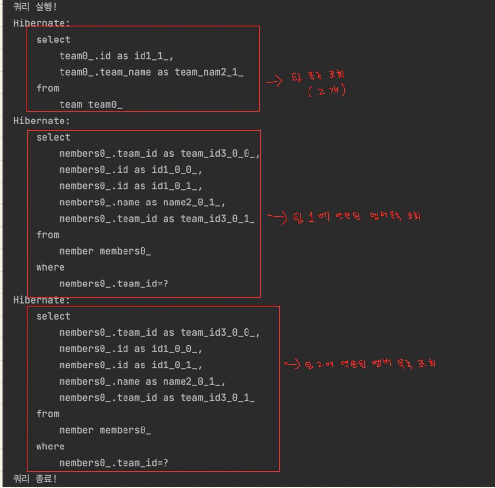 즉 N(Team의 총 갯수) + 1(Team목록 조회 쿼리문)개의 쿼리문이 실행된다.
