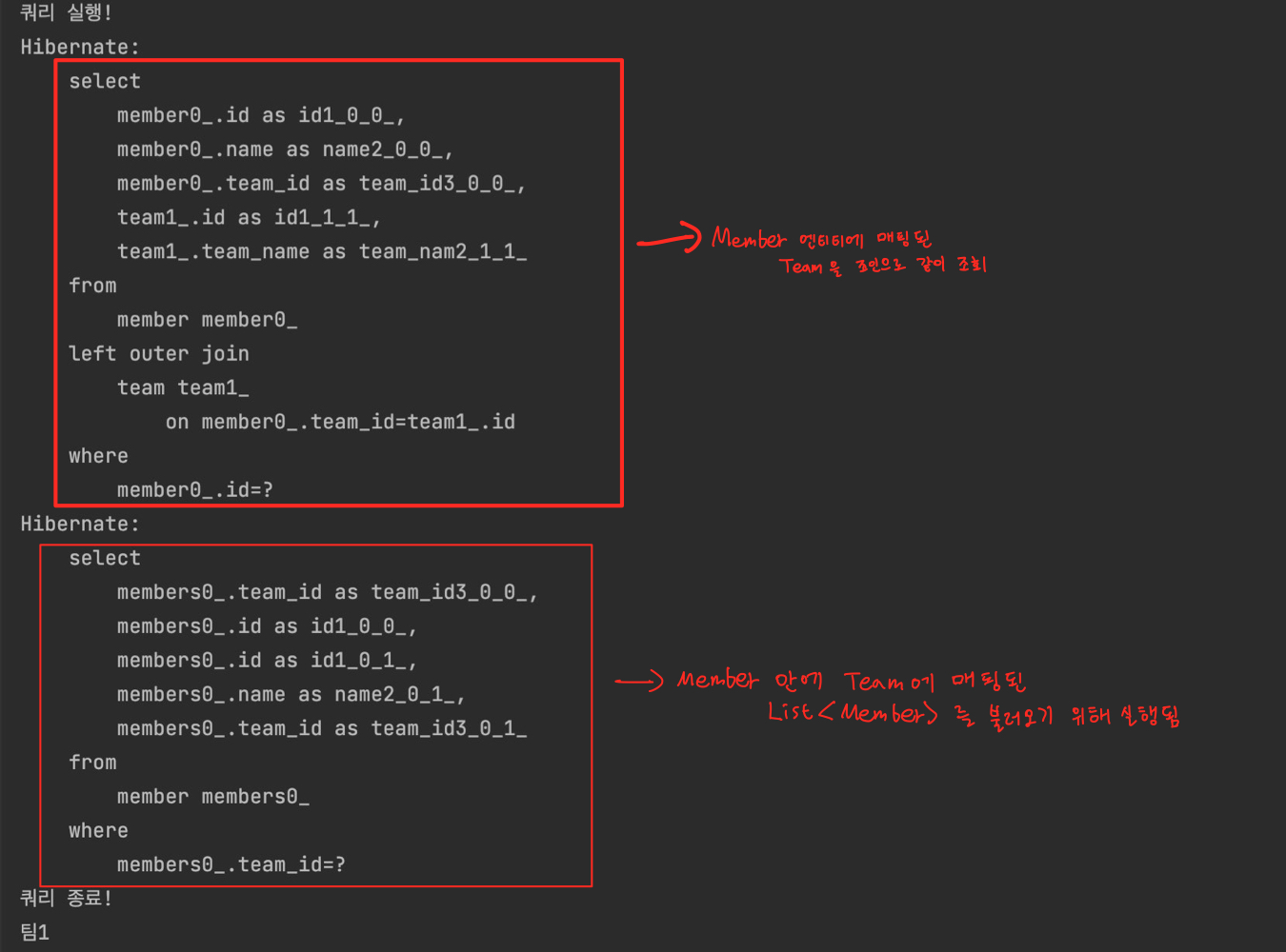 두 개의 쿼리가 실행됐는데 먼저 실행된 쿼리는 Member를 조회할 때 Member에 ManyToOne으로 걸린 팀의 데이터를 같이 가져오느라 조인 쿼리가 실행된 것을 볼 수 있다.