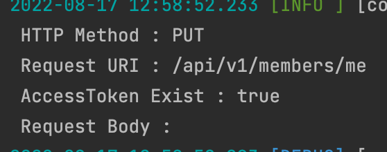 찍고싶은 요청 정보는 HTTP Method, Request URI, AccessToken 존재 여부, Request Body 정도였다.