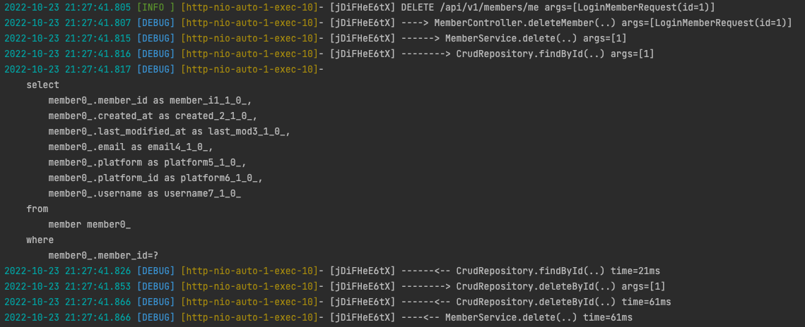 메서드가 끝날땐 마찬가지로 작업 ID와 메서드 정보를 남기고, 추가로 그 메서드가 종료되는데 걸린 시간을 로깅한다. 만약 해당 메서드에서 성능 문제가 발생했다면 이 로그를 통해 유추해볼 수 있다.