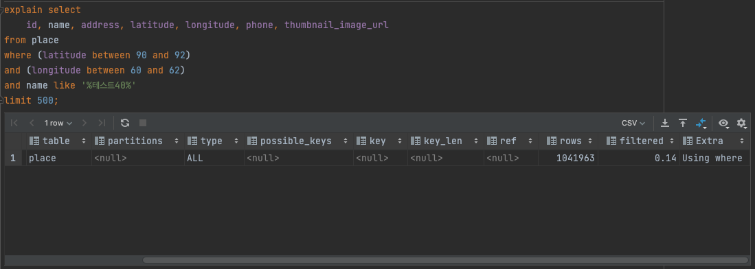 "attached_condition": "((`chess`.`place`.`latitude` between 90 and 92) and (`chess`.`place`.`longitude` between 60 and 62) and (`chess`.`place`.`name` like '%테스트1%'))"